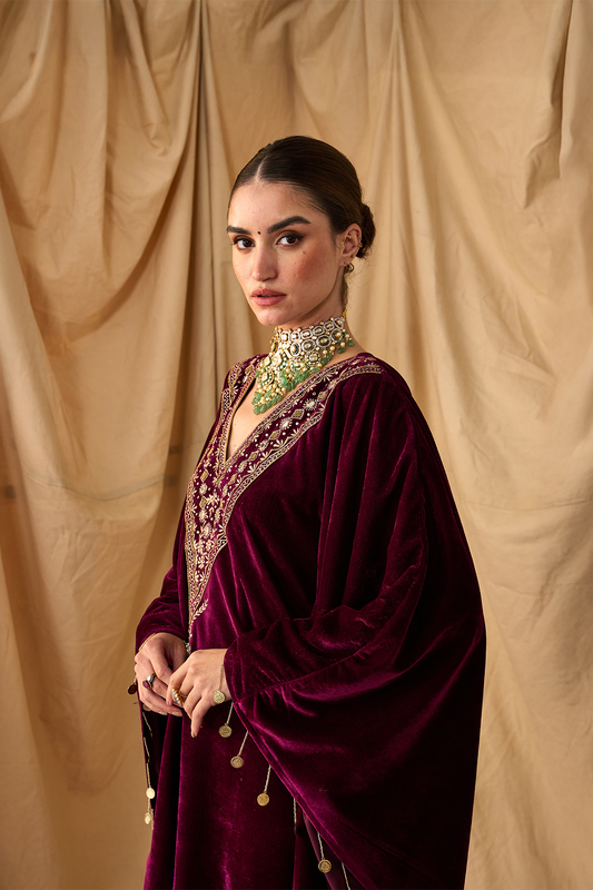 Sikka Velvet Zari Maroon Kaftan Set